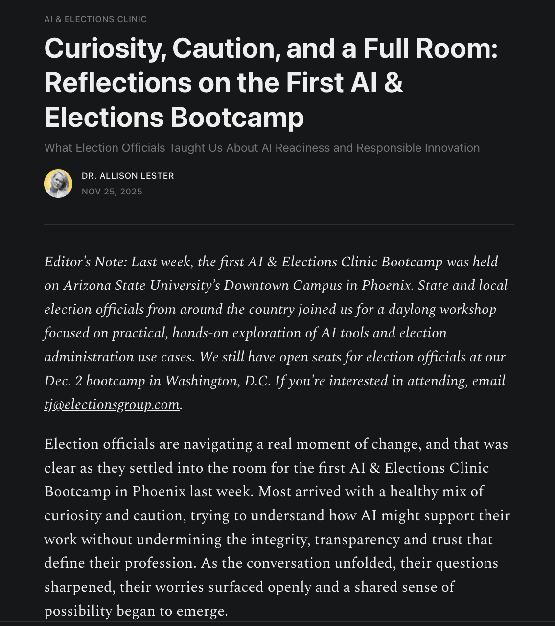 Lester, A. J. (2025, November 25). Curiosity, caution, and a full room: Reflections on the first AI & Elections Bootcamp. AI & Elections Clinic: Ideas & Implications.