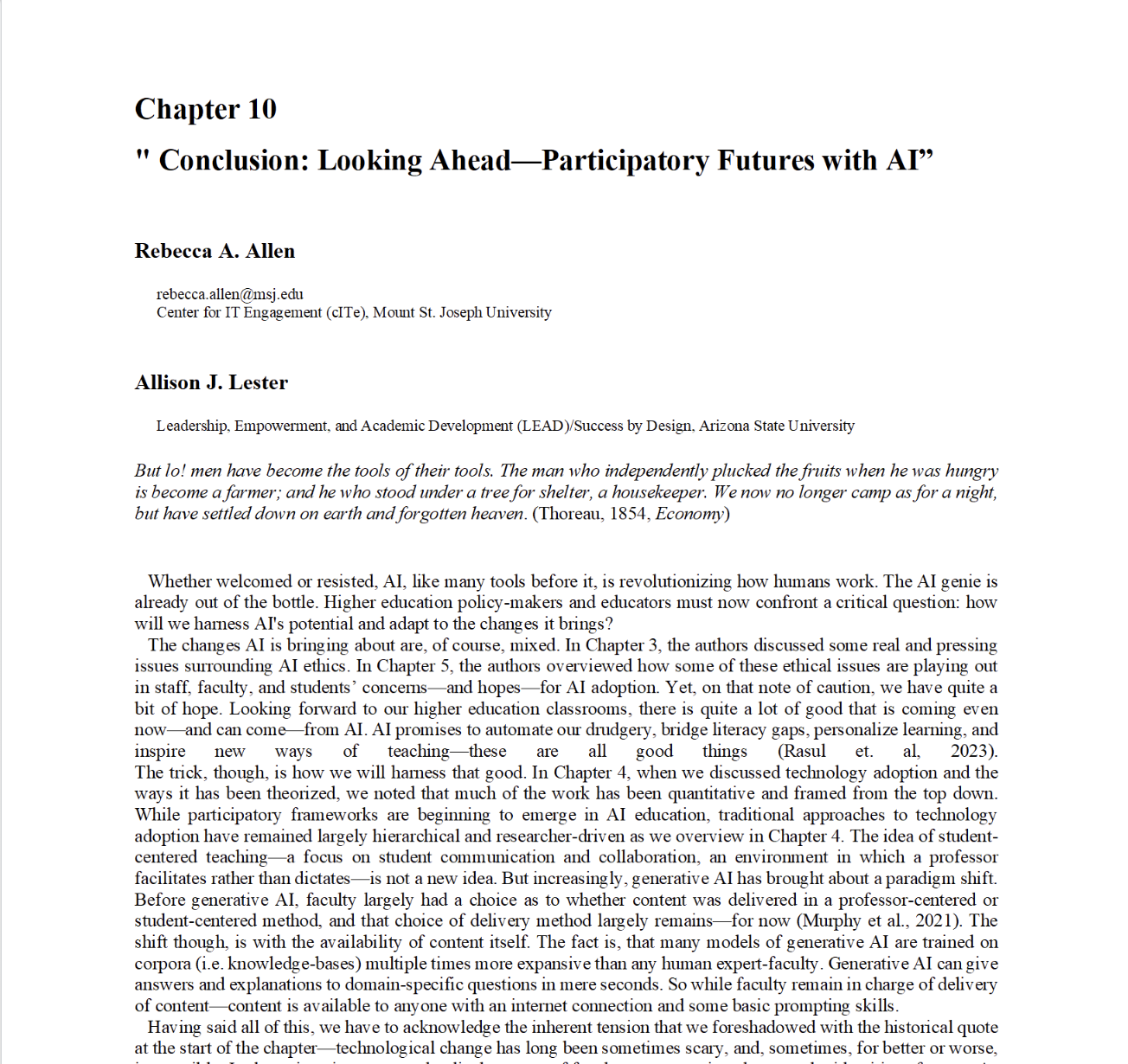 Allen, R. A., & Lester, A. J. (2023). Conclusion: Looking ahead—Participatory futures with AI. In R. A. Allen (Ed.), In Using and Understanding AI in Higher Education Classroom Research with Real-World Strategies. Palgrace MacMillan.