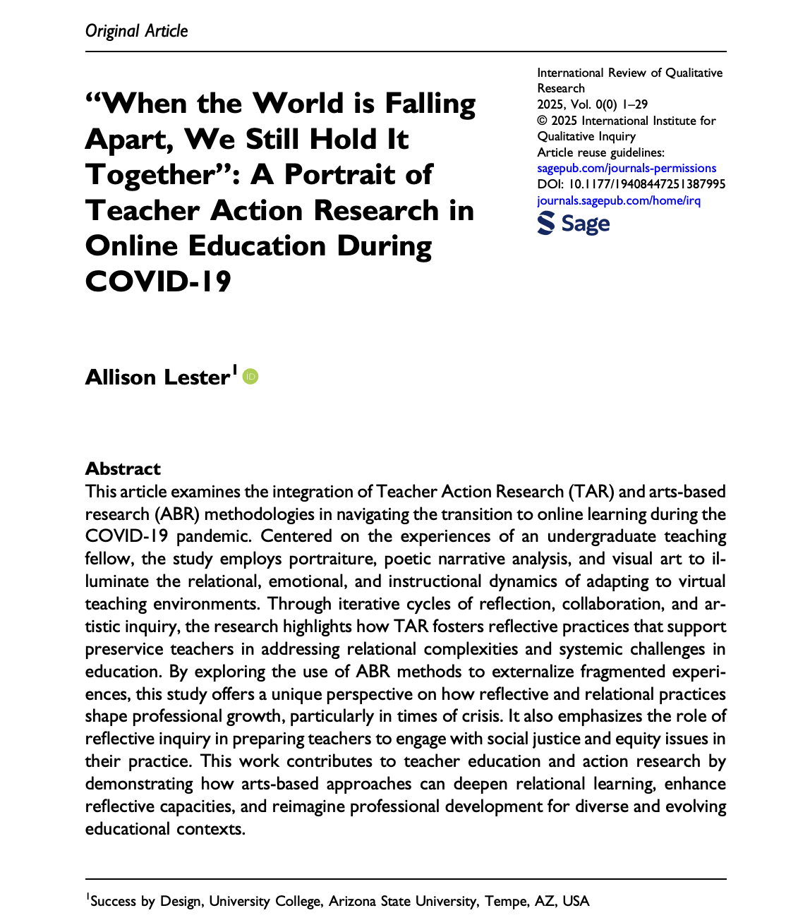 Lester, A. (2025). “When the world is falling apart, we still hold it together”: A portrait of teacher action research in online education during COVID-19. International Review of Qualitative Research, 0(0), 1–29.