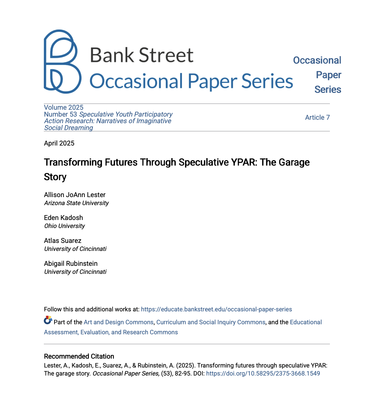 Lester, A. J., Kadosh, E., Suarez, A., & Rubinstein, A. (2025). Transforming futures through speculative YPAR: The garage story. Bank Street Occasional Paper Series, 53, 82–95.