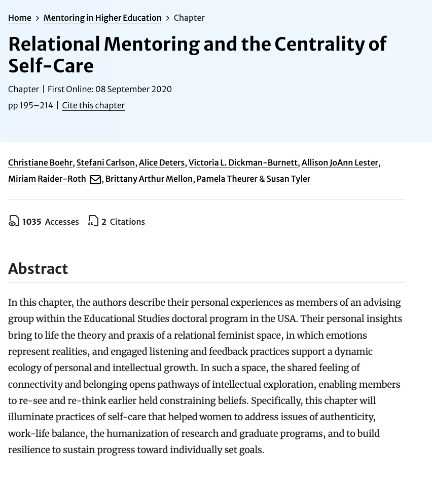 Boehr, C., Carlson, S., Deters, A., Dickman-Burnett, V. L., Lester, A. J., Raider-Roth, M., Arthur Mellon, B., Theurer, P., & Tyler, S. (2020). Relational mentoring and the centrality of self-care. In C. Boehr, S. Carlson, A. Deters, & V. L. Dickman-Burnett (Eds.), Mentoring in higher education (pp. 195–214). Springer.