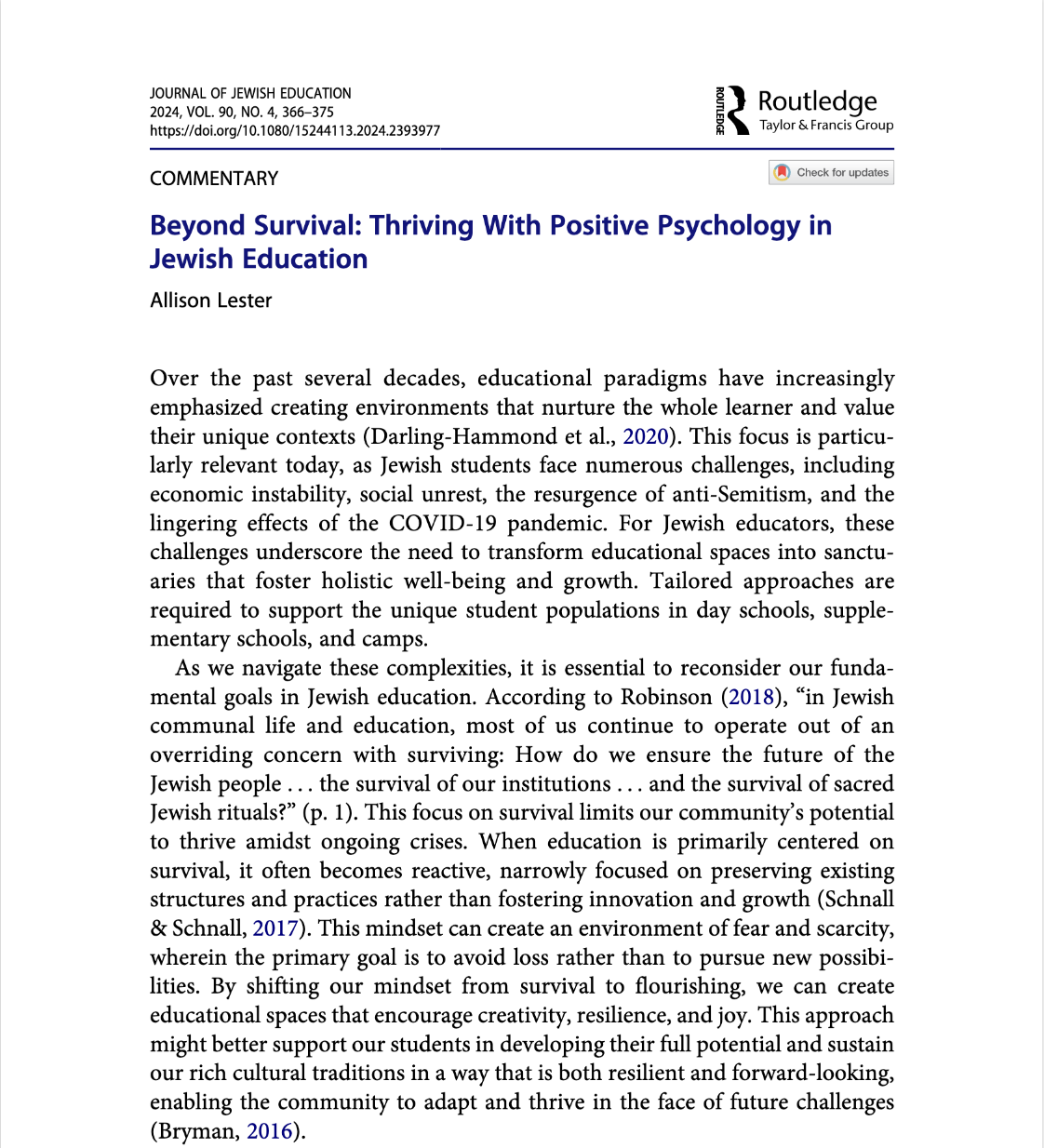 Lester, A. (2024). Beyond survival: Thriving with positive psychology in Jewish education. Journal of Jewish Education, 90(4), 366–375.